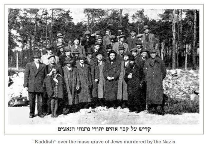 תמונה של יהודים משארית הפליטה אחרי שאמרו קדיש על קבר אחים
