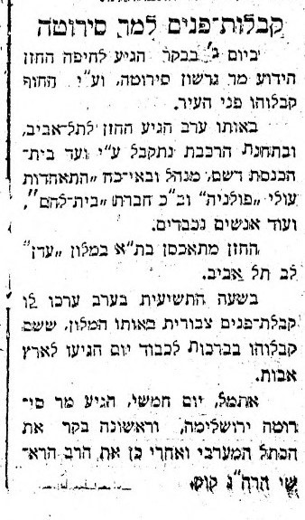 "החזן המפורסם של בית הכנסת בוורשה, סירוטה, נותן מחר את הקונצרט היחיד שלו באולם הגדול של הקונסרבטוריון. לסירוטה יש טנור קולורטורה מרהיב, המתחרה ביופי ובעוצמה של הצליל עם הקולות של טמאגנו וקרוסו. התכנית כולה מוקדשת לשירה רוחנית יהודית. הכרטיסים כמעט כולם אזלו".